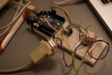 Arduinos haben serielle Schnittstellen, mit denen die Terminals allerdings nicht direkt angesteuert werden konnten, da sie die falsche Spannung liefern (0/5 V anstatt -12/+12 V). Mit einem kleinen IC lies sich aber auch dieses Problem in den Griff bekommen, sodass jetzt alle drei Terminals von einem Arduino angesteuert werden können. Mit diesem Aufbau lässt sich beispielsweise eine Laufschrift über alle drei Monitore realisieren. Wer schon mal bei einer unserer Veranstaltungen war, konnte das auch schon live bestaunen.