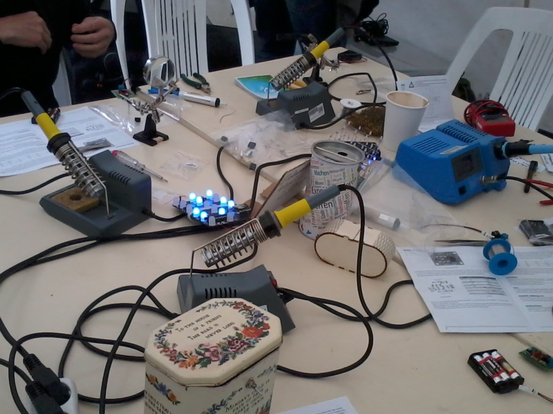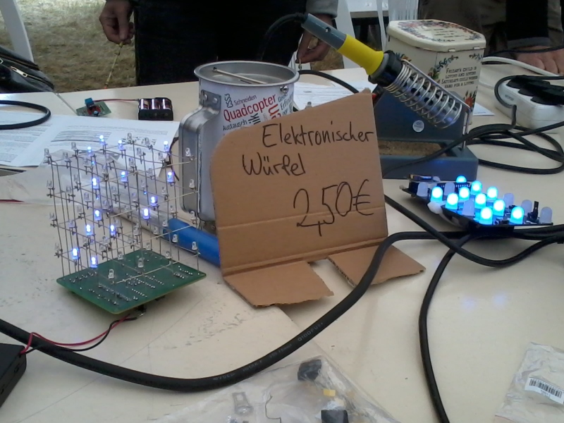 Auch dieses Jahr waren wir wieder beim FREIFELD-FESTIVAL vertreten. Die Idee war, einen Lötworkshop anzubieten. Und so löteten die Festivalbesucher an unserem Stand aus einem Bausatz einen elektronischen Würfel zusammen. Jeder Teilnehmer brachte ganz unterschiedliche Erfahrungen bezüglich Elektronik und Lötkolben mit und erhielt entsprechende Hilfestellungen. Der mit 8 Jahren jüngste Teilnehmer erklärte seiner Mutter wie es geht ;-) viele Besucher zeigten großes Interesse am Hackspace und wollen “mal vorbeischauen” - gerne!