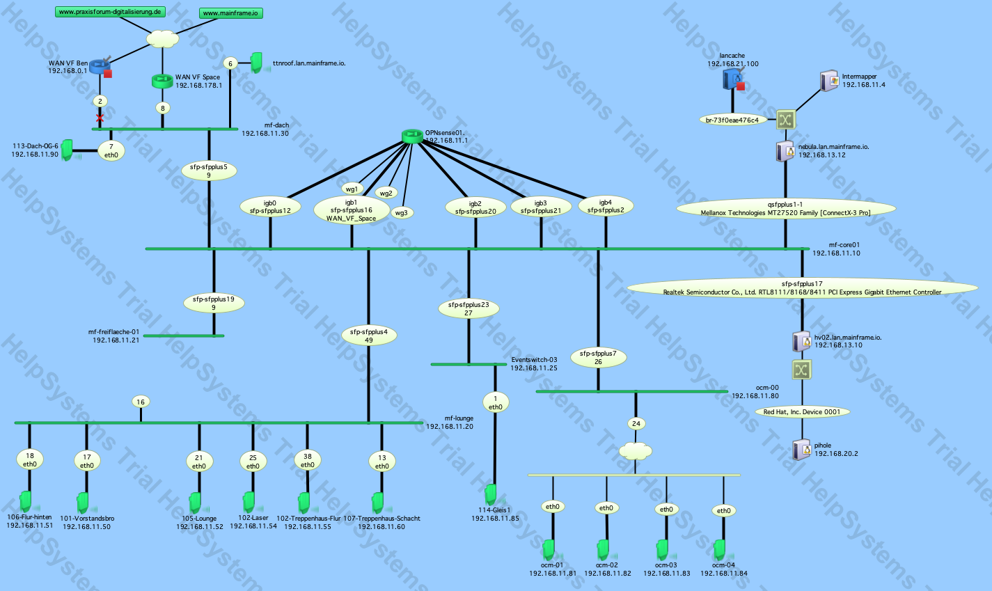 Das WLAN erstreckt sich im Mainframe vom Treppenaufgang bis zur Toilette (ja wir haben auch auf der Toiletten gutes WLAN) mit insgesamt 5x 802.11ac fähigen Access Points.