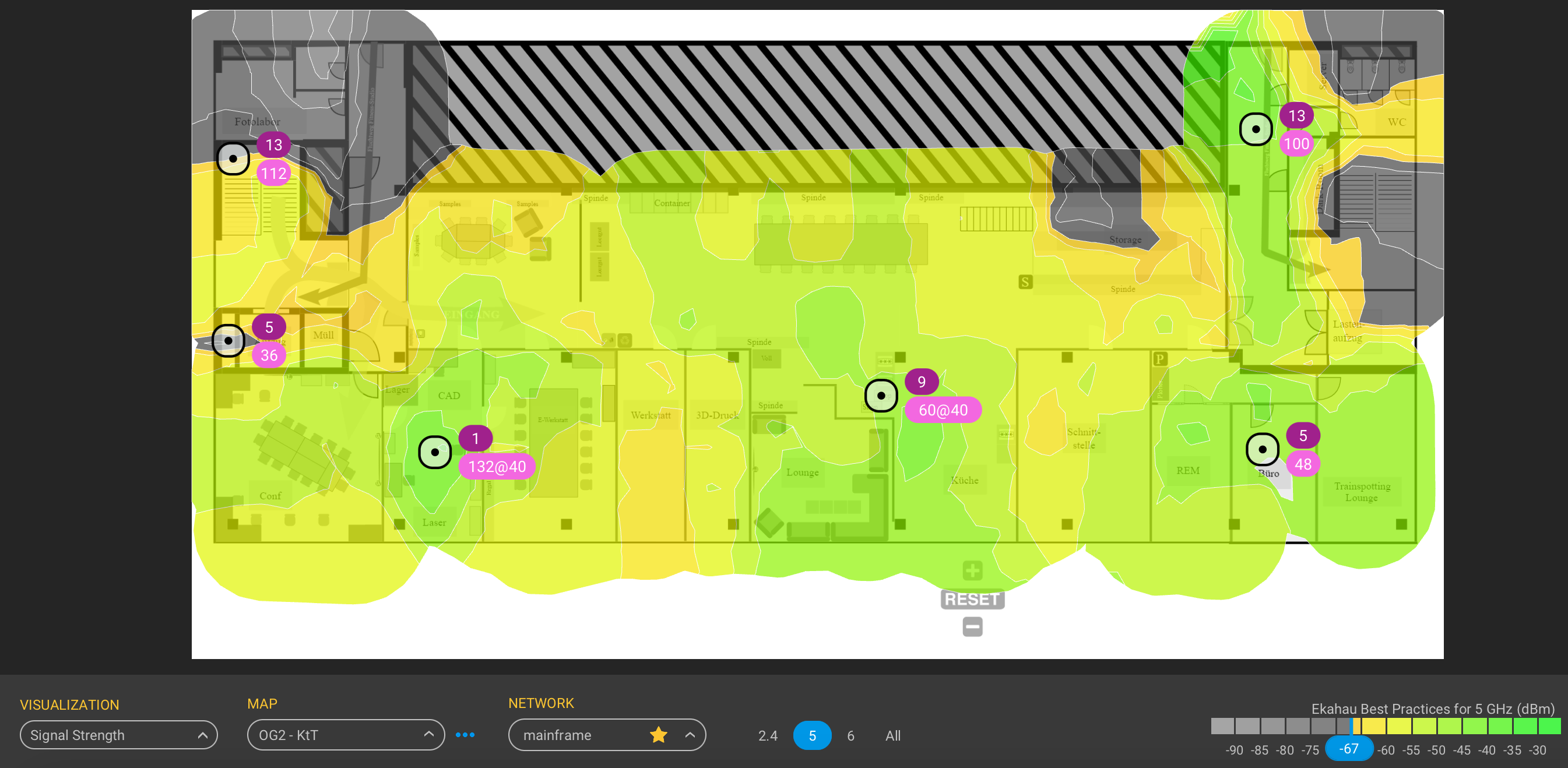 Um ein möglichst leistungsfähiges WLAN anbieten zu können, ist die Infrastruktur so gebaut, dass es so gut wie keine Kanalüberlappungen mit anderen Access Points gibt und somit Interferenzen verhindert werden. Zudem werden die WLANs für Nutzerendgeräte exklusiv in 5 GHz angeboten, während IoT und anderer “Kleinscheiß” dafür im 2.4GHz Band beherbergt ist.