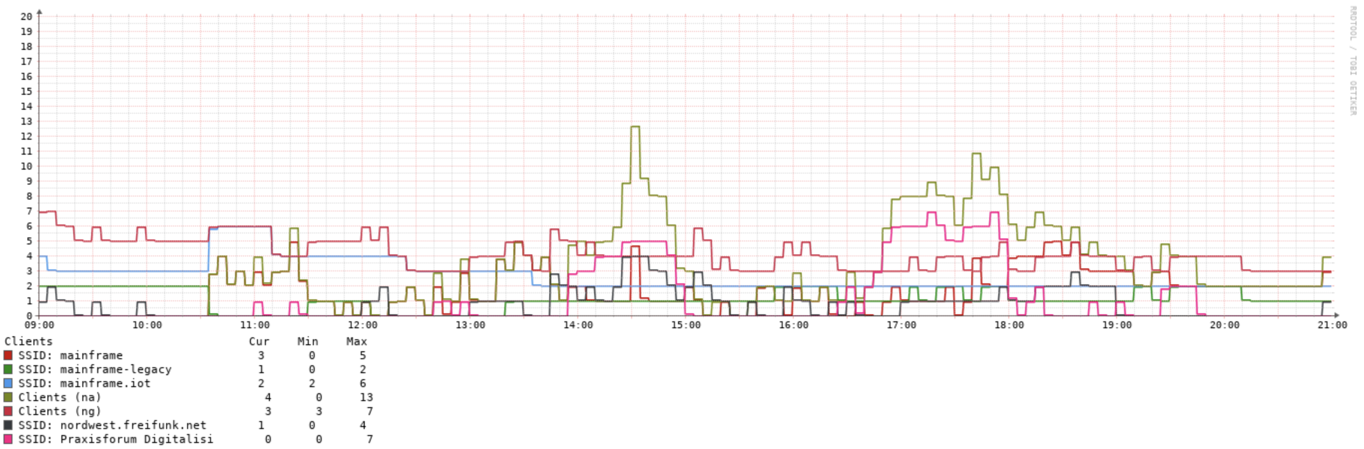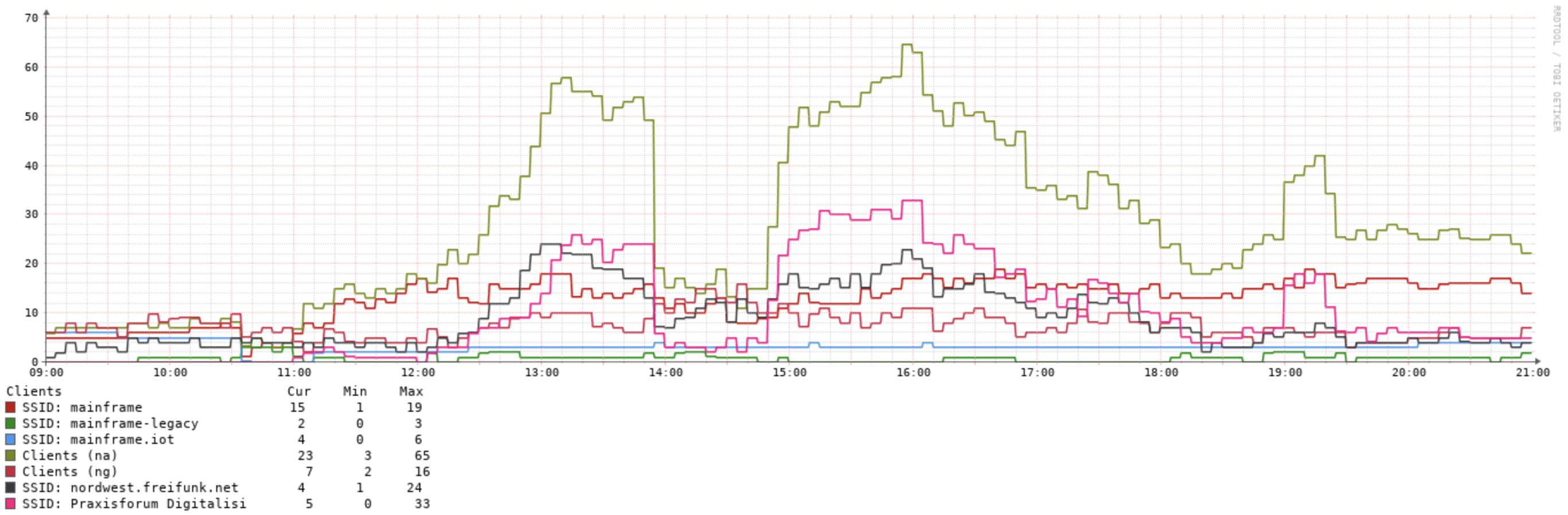 Wir knackten an diesem Freitag die Gesamtmenge von 200 Endgeräten im WLAN, mit einem Peak von 60+ Geräten auf dem Access Point in der Lounge.