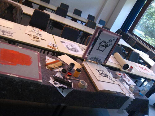 Die Siebe können wir sogar im Space herstellen: Dazu wird das Sieb zuerst mit einer lichtempfindlichen Emulsion beschichtet. Anschließend legt man eine Vorlage darauf und belichtet es unter UV-Licht: Die belichteten Stellen härten aus, die abgedeckten (Motiv-)Bereiche bleiben weich und werden danach mit Wasser ausgewaschen – so entstehen die durchlässigen Druckbereiche im Sieb.
