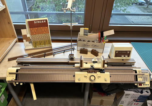 Schon seit einigen Jahren gibt es in unserem Space mehrere Strickmaschinen. Lange standen sie ungenutzt herum, doch inzwischen haben wir sie gründlich gereinigt, teilweise repariert und wieder in Betrieb genommen. Mit viel Einsatz – und ein paar selbstgebauten Ersatzteilen – laufen sie jetzt richtig gut.