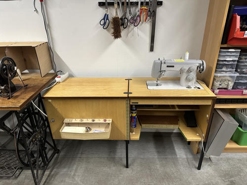 Zunächst gibt es eine Reihe von Nähmaschinen. Dabei sind einige moderne Maschinen, die auch komplexe Stiche umsetzen können und einige ältere Geräte, die auch bei einem Stromausfall gut funktionieren.